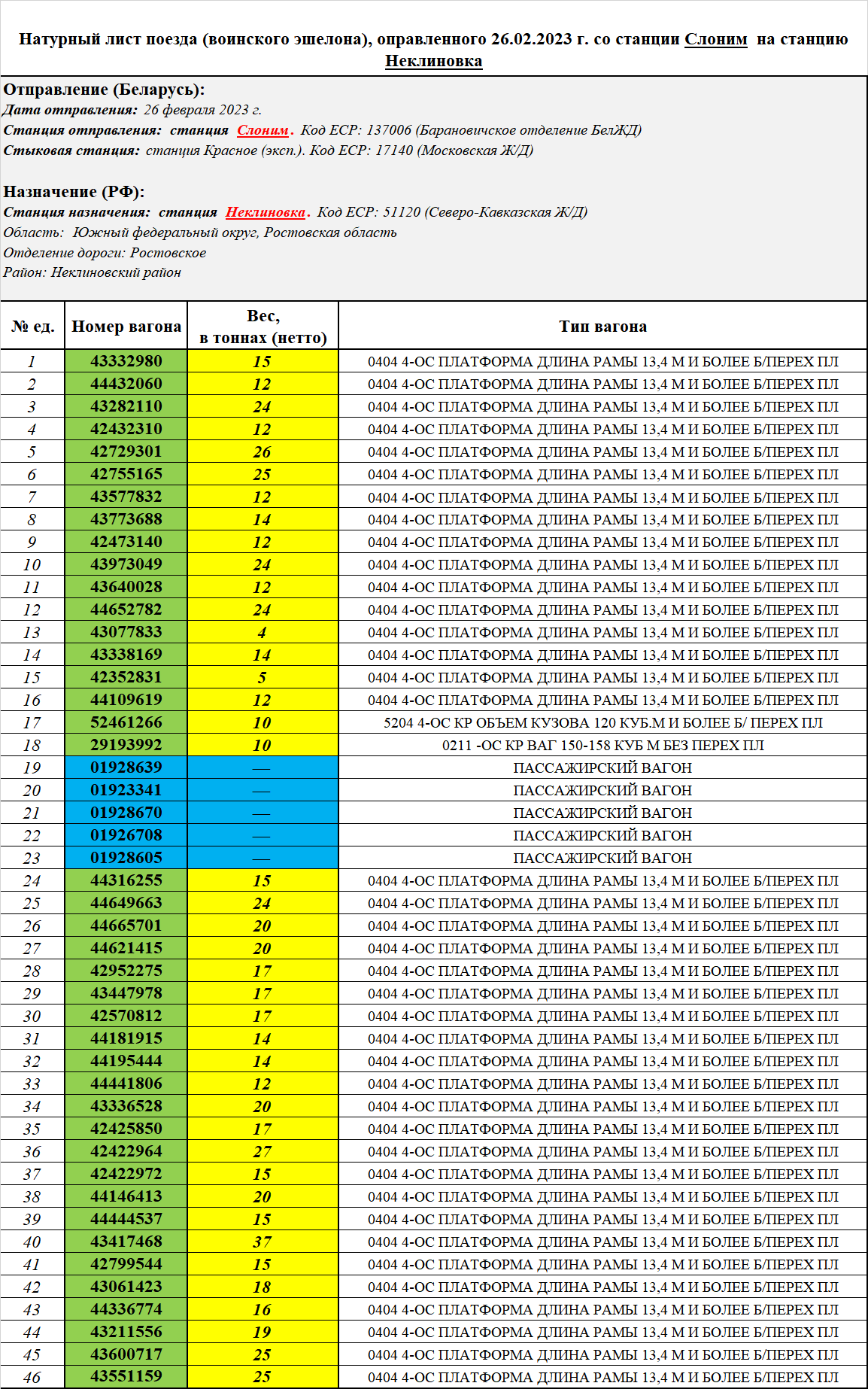 26.02.2023 года со станции Слоним (Барановичское отделение БЖД) на станцию Неклиновка (Северо-Кавказская Ж/Д) был отправлен воинский эшелон №964, в составе которого находилось 46 вагонов, из них: